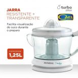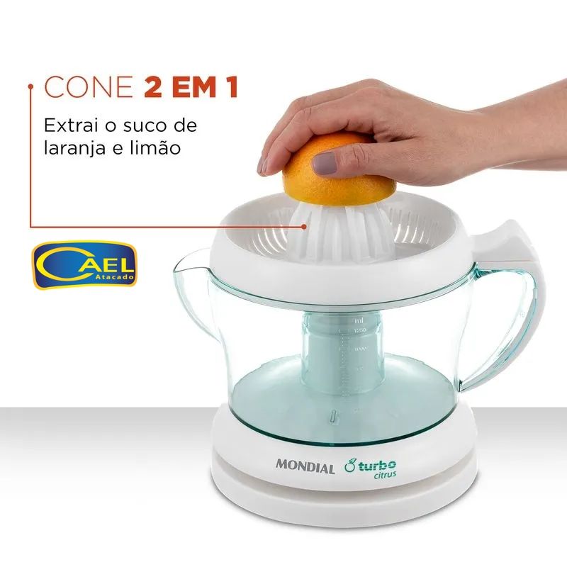 Com o Espremedor Turbo Citrus Mondial você faz sucos deliciosos de forma rápida e preserva o frescor da fruta. A capacidade de 1,25 litros produz bastante suco e basta pressionar a fruta no espremedor para acionar o equipamento, tirando o máximo de extração.