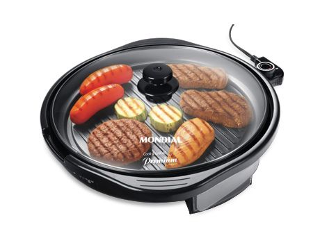 Este Grill Redondo G-04 tem 30 CM e pode ir à mesa. Com 1200W de potência, ele é mais rápido. Mais saudável, sua grelha antiaderente não gruda e dispensa óleo. Deixe-a inclinada para a gordura escorrer para o coletor. Este grill elétrico tem controle de temperatura, tendo mais precisão. Quer saber o que faz um grill? Além de grelhar, ele faz receitas completas, como arroz, risotos, legumes e strogonoff. Escolha se quer deixar a grelha inclinada para que a gordura escorra para a bandeja coletora, que pode ser retirada para limpeza. Com a sua tampa de vidro temperado, você evita respingos e a comida fica pronta mais rápido. Por ser transparente, você vê quando a comida está pronta. E a tampa tem uma válvula para saída de vapor. Este grill é da Mondial para quem quer economizar espaço. Se quer um maior, indicamos o Grill 40 Premium G-03 de 40 cm.