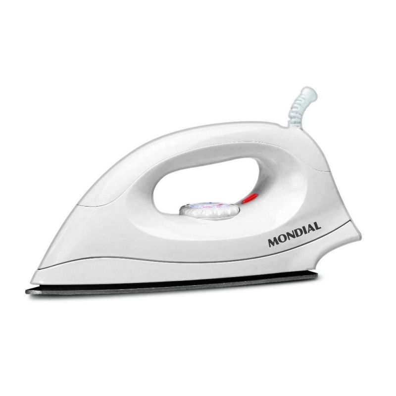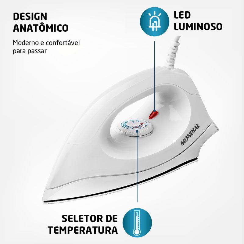 Aquele ferro prático que cabe em qualquer lugar... O Ferro a Seco com Base de Alumínio Polido FSN-55-W branco da Mondial é um ferro de passar roupas que aquece rápido, desliza com segurança, tem 6 temperaturas e 1000W de potência. Com DESIGN ANATÔMICO, o FSN-55-W tem estilo moderno e seu deslizamento fácil faz com que passar roupas não seja um sufoco ou musculação. Sua BASE DE ALUMÍNIO POLIDO permite a distribuição uniforme e rápida do calor, portanto serve muito bem a quem não precisa de vapor para desamassar os vincos mais difíceis - e é perfeito para aqueles que gostam de dar uma alisada rápida nas peças antes de vestir e sair. O Ferro de passar FSN-55-W conta com 6 níveis de temperaturas para ser adequado a tecidos dos mais leves e delicados aos pesados, de fios naturais.
