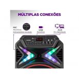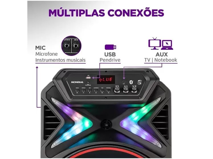 MÚLTIPLAS CONEXÕES (USB/AUX/MIC/GUITAR): Entradas para conectar microfone, Pen Drive, MP3, MP4 e instrumentos musicais.