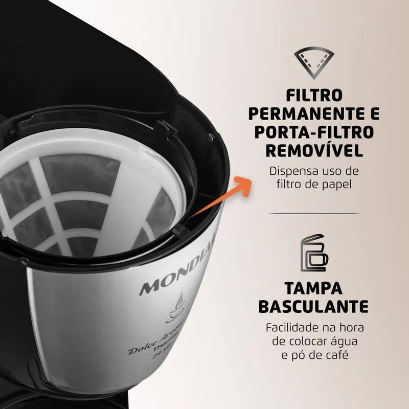 - Filtro permanente e porta-filtro removível: a cafeteira dispensa a utilização do filtro de papel. Além de economizar, você ainda torna o seu dia a dia mais sustentável;