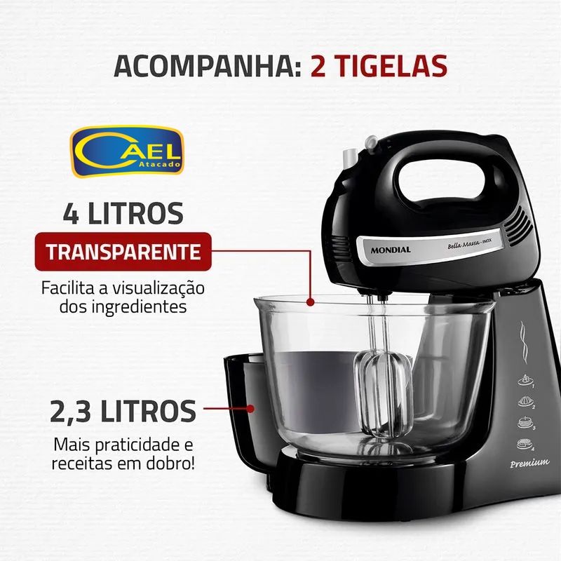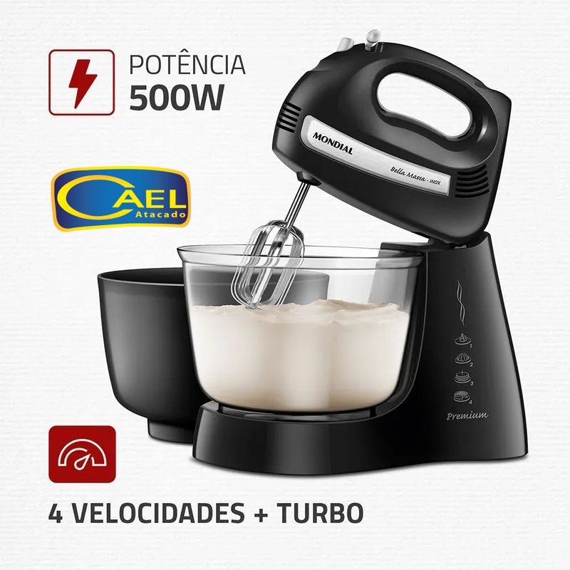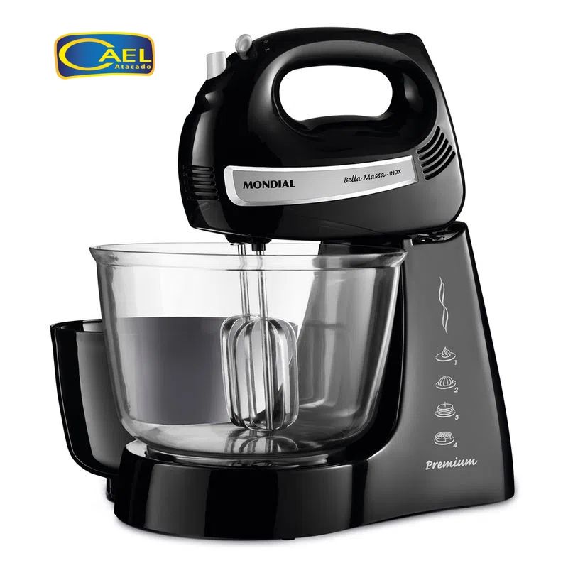 A Batedeira Bella Massa Inox Premium B-23-NP garante performance, praticidade e precisão em suas receitas! Possui 500W de potência, 4 velocidades para controlar o tipo de massa a ser preparada e função turbo para aumentar o desempenho. Acompanha 2 tigelas, com capacidade de 4 e 2,3 litros. Além disso, os batedores em aço cromado, além de mais duráveis, deixam a massa no ponto certo.