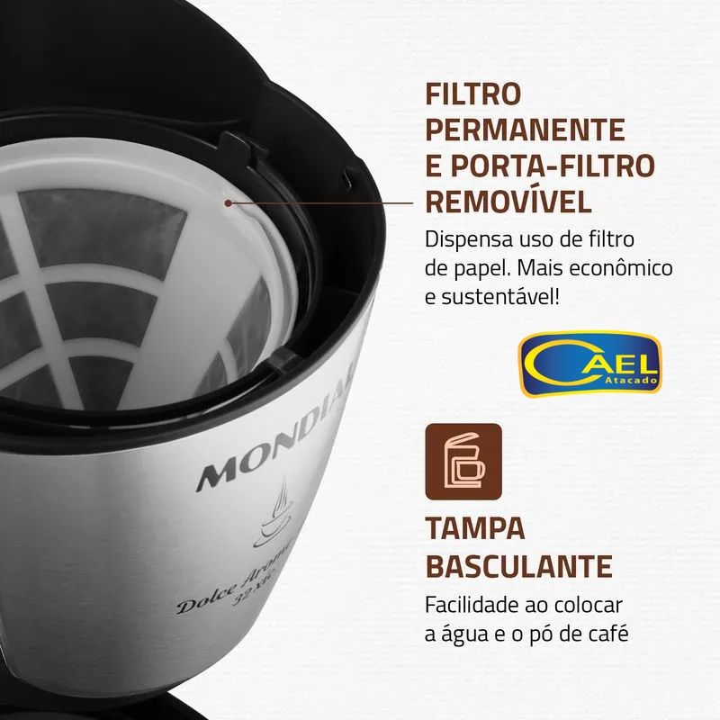 - Filtro permanente e porta-filtro removível: a cafeteira dispensa a utilização do filtro de papel. Além de economizar, você ainda torna o seu dia a dia mais sustentável;