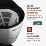 - Tampa basculante: facilita o acréscimo de água e pó de café, bem como sua limpeza; e
