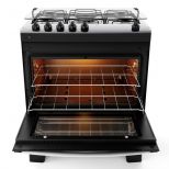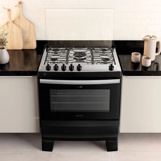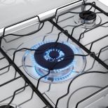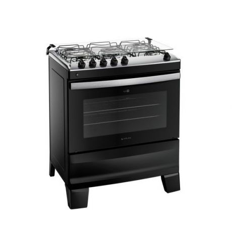 A versão 5 bocas conta com 2 queimadores semirrápidos de 1,67kW, 2 queimadores rápidos de 2,0kW, 1 queimador Tripla Chama de 3,3kW e forno com 86,5 litros de capacidade.