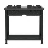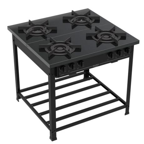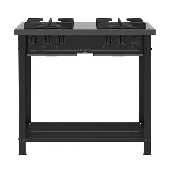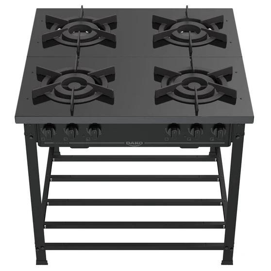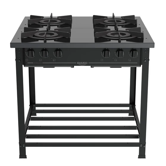 O novo fogão industrial Dako Couraçado conta com mesa em aço esmaltado com revestimento Limpa Fácil; ignição manual; 4 queimadores, sendo 2 frontais com Dupla Chama de 5,2kW e duplo controle e 2 traseiros com Mega Chama de 4,1kW; grades extra largas e robustas de ferro fundido com 6 pontos de apoio, que suportam grandes panelas; bandeja coletora de resíduos e base em treliça para armazenamento e suporte.
