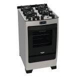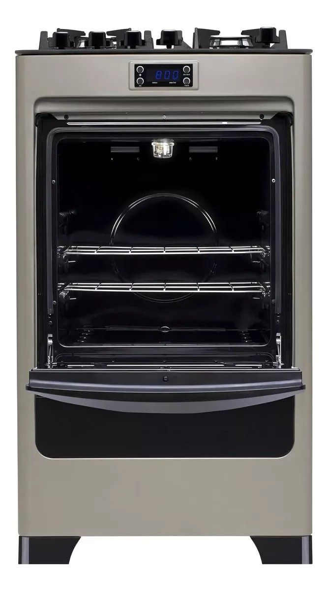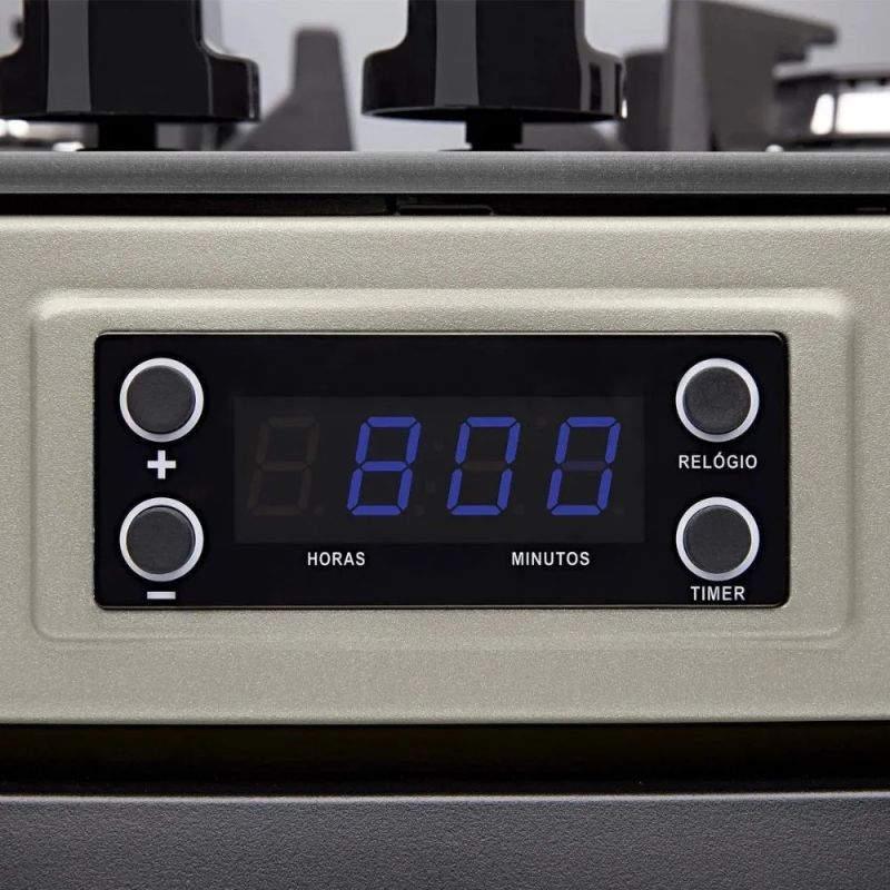 Com mesa de vidro temperado sem moldura e top control, o fogão ainda conta com botões removíveis, que facilitam na hora da limpeza. Além disso, é equipado com trempes de ferro fundido, acendimento automático e timer digital com alarme sonoro, que permite o monitoramento de suas receitas.